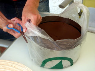 Steckmasse in Plastiktüe setzen und Überstehendes abschneiden