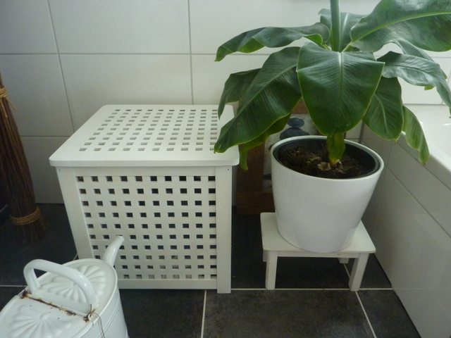 Bei unserem Nachbarn habe ich gesehen, wie er seine Sichtschutzwände farbig gesprüht hat. Das hat mich auf die Idee gebracht unsere Wäschekisten, die aus Naturholz waren und mir gar nicht mehr gefallen haben, auch mal weiß zu spritzen.