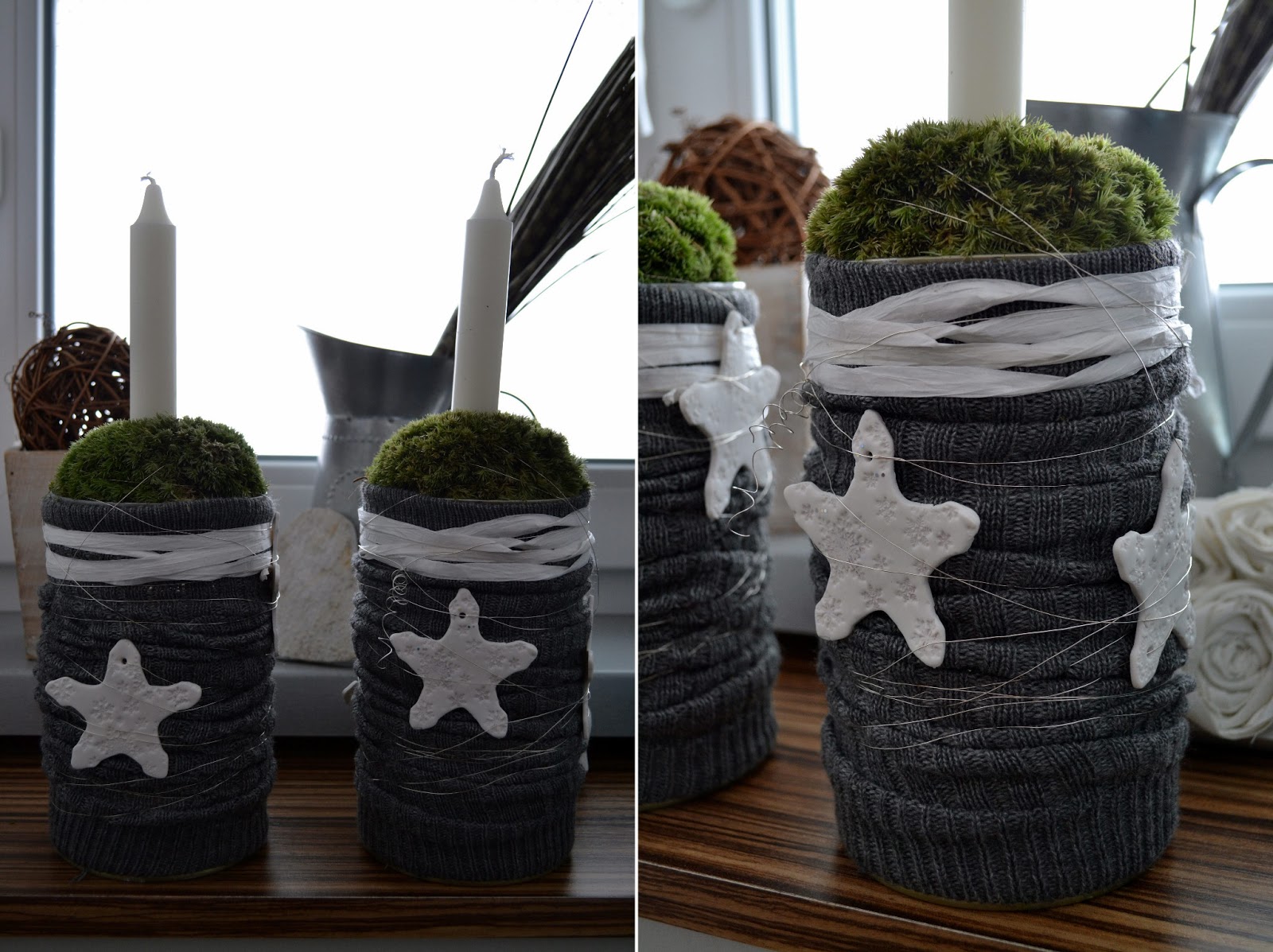 Über leere (und natürlich saubere!) Hundefutterdosen habe ich graue Strickstulpen gezogen. mit Moos, weißem Bast, Silberdraht und Schneeflocken aus FIMO dekoriert.