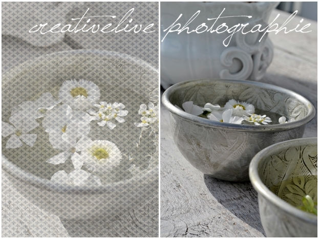 Da es im Garten jetzt schon so einiges an Blüten gibt, habe ich eine Schale mit Wasser gefüllt und die süßen weißen Blüten schwimmen geschickt.