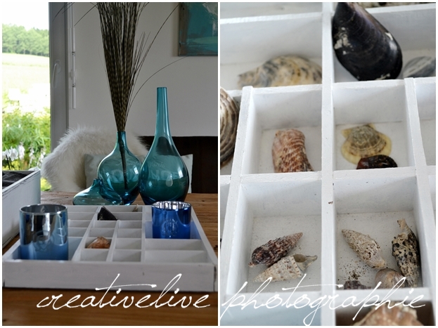 Auf dem Esstisch habe ich mal wieder den Setzkasten, diesmal mit Muscheln, dekoriert.