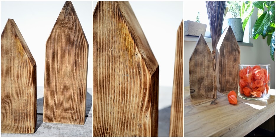 Die Holzhäuser selber zu machen ist eine tolle Idee. Die angekokelten schauen besonders hübsch aus.