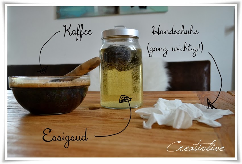 wenn du das in der Wohnung tun willst….musst du alles gut abdecken! Der Kaffee und der Essig sind ja sehr flüssig und so tropft es ordentlich daneben! Außerdem liegt ein starker Essiggeruch in der Luft!