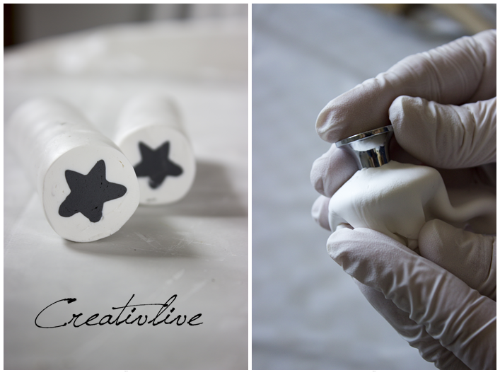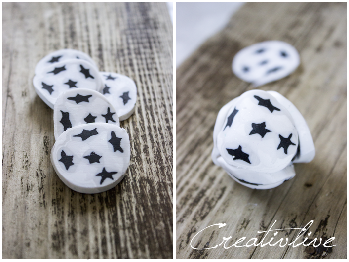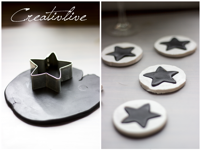 Graue Sterne in die weißen Kreise legen, noch etwas weißes Fimo um die Kreise herum